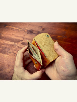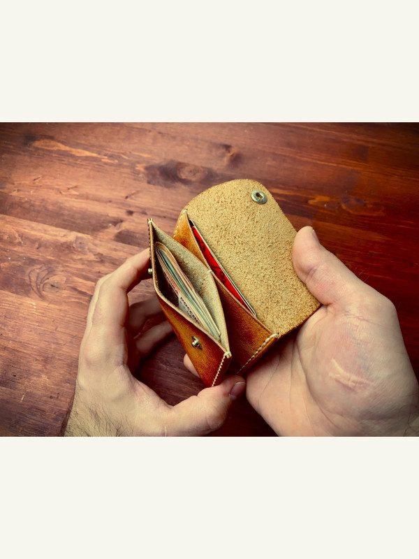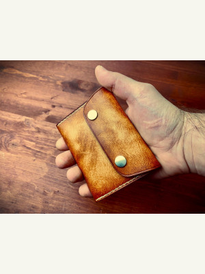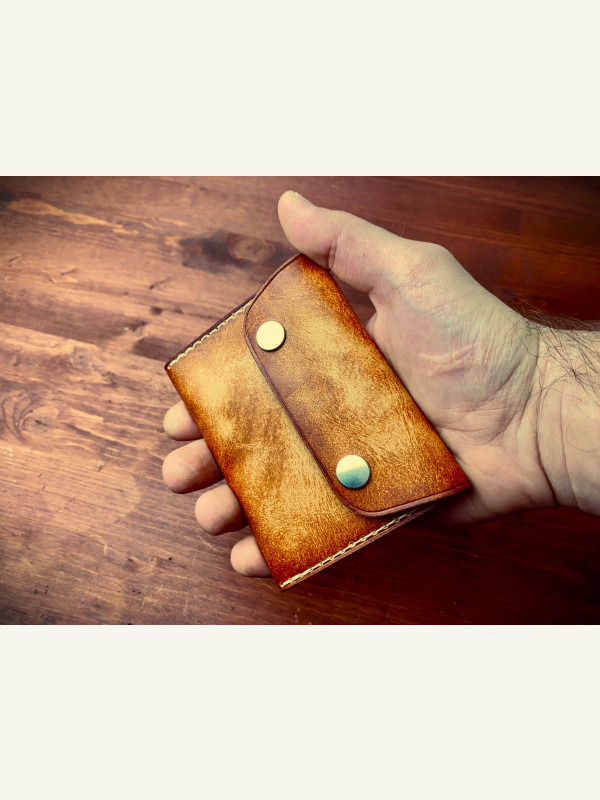 Представляю выкройку такого простенького мини-кошелька. Кожу использовал растишку в районе 2 мм, для толщины 1.8-2.0 мм отлично подходит. Шаг пробойника 5 мм. Кнопки 13 мм. Выкройку прикрепляю. В моей группе так же есть другие бесплатные выкройки, подписывайтесь